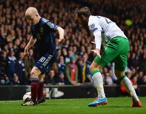 GLASGOW, SCOTLAND – NOVEMBER 14: Steven Naismith of Scotland shields the ball from Richard Keogh of the Republic of Ireland during the EURO 2016 Group D Qualifier match between Scotland and Republic of Ireland at Celtic Park on November 14, 2014 in Glasgow, Scotland. (Photo by Mark Runnacles/Getty Images)