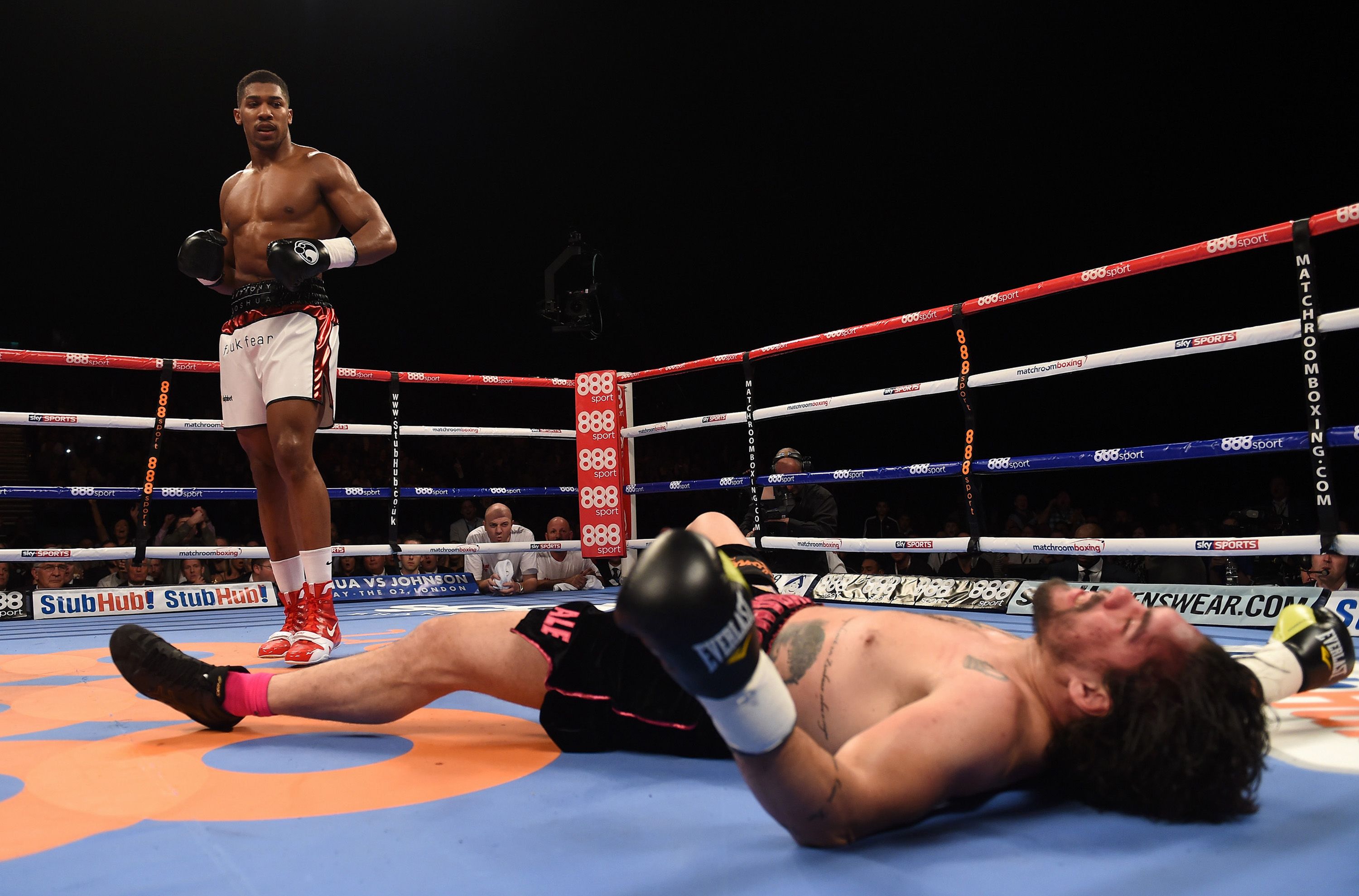 BIRMINGHAM, ENGLAND - MAY 09: Anthony Joshua (White Shorts) knocks out Raphael Zumbano Love during the Heavyweight Contest during Resurrection Fight Night at Barclaycard Arena on May 9, 2015 in Birmingham, England. (Photo by Christopher Lee/Getty Images)