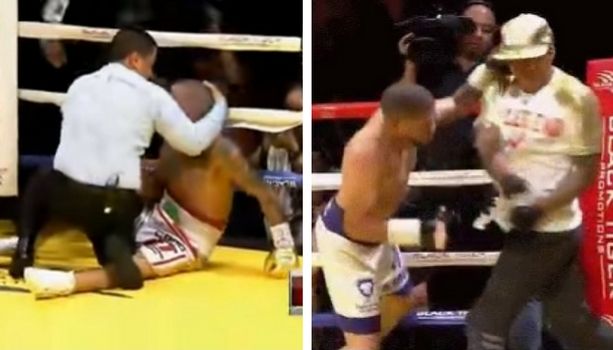 But as the 33-year-old fighter was celebrating the KO victory, his rival’s cornerman jumped into the ring and the two men went for each other.