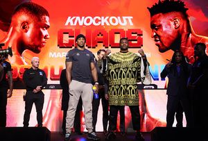 LONDON, ENGLAND - JANUARY 15: Anthony Joshua and Francis Ngannou pose during the Anthony Joshua v Francis Ngannou Press Conference at Outernet London on January 15, 2024 in London, England. (Photo by Alex Pantling/Getty Images)