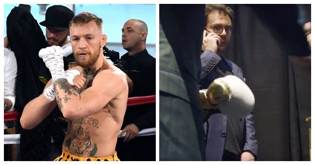 Backstage after Thursday night’s press conference, McGregor is seen asking to see his new boxing gloves.