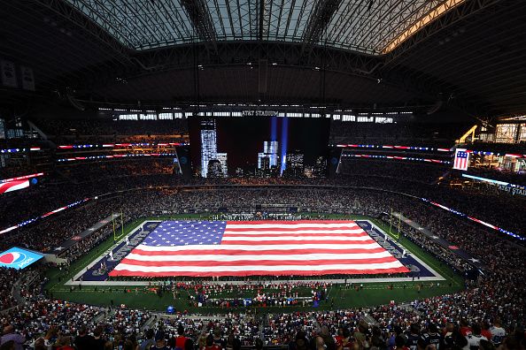 ARLINGTON, TEXAS - SEPTEMBER 11: A general view inside AT&T Stadium during the national anthem with an American Flag over the field before the game between the Tampa Bay Buccaneers and the Dallas Cowboys on September 11, 2022 in Arlington, Texas. (Photo by Richard Rodriguez/Getty Images)
