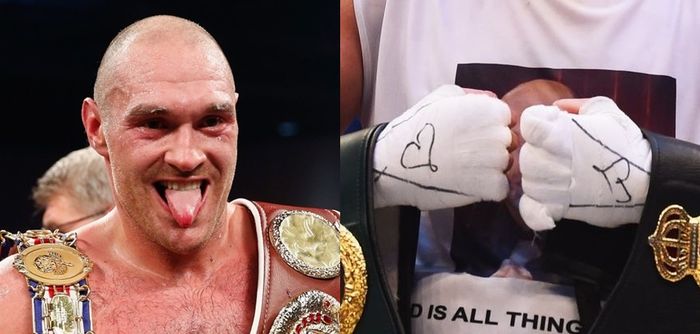 The eagle-eyed among you may have noticed the two love hearts scribbled on Tyson Fury’s tape during his celebrations on Saturday night – and the world champ has now revealed the reason behind the bizarre drawings.