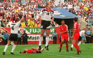 2 JUL 1994: JUERGEN KLINSMANN, CENTER, GUIDO BUCHWALD, LEFT AND RUDY VOLLER, FAR RIGHT, OF GERMANY CELEBRATE AFTER VOELLER SCORED HIS SECOND GOAL AGAINST BELGIUM DURING THE 1994 WORLD CUP AT SOLDIER FIELD IN CHICAGO, ILLINOIS. GERMANY WON, 3-2, ELIMINAT