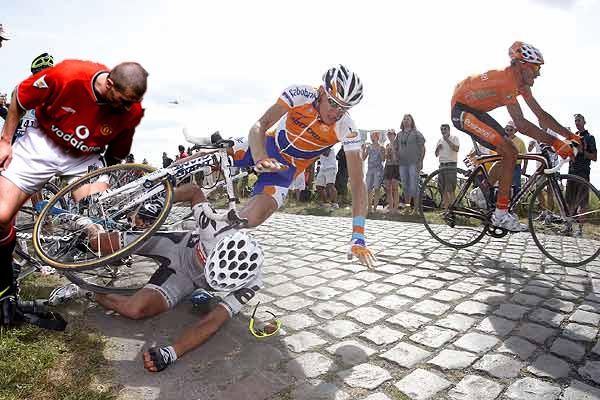Riders fall on the cobblestones during the third stage of the Tour de France cycling race between Wanze and Arenberg-Porte Du Hainaut, July 6, 2010. REUTERS/Eric Gaillard (FRANCE – Tags: SPORT CYCLING)