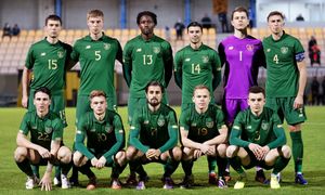 18 November 2020; The Republic of Ireland team, back row, from left, Thomas O'Connor, Mark McGuinness, Joshua Ogunfaolu-Kayode, Danny Mandroiu, Ed McGinty and Conor Masterson. Front row, from left, Danny McNamara, Connor Ronan, Zach Elbouzedi, Anthony Scully and Darragh Leahy ahead of the UEFA European U21 Championship Qualifier match between Luxembourg and Republic of Ireland at Stade Henri-Dunant in Beggen, Luxembourg. Photo by Gerry Schmidt/Sportsfile