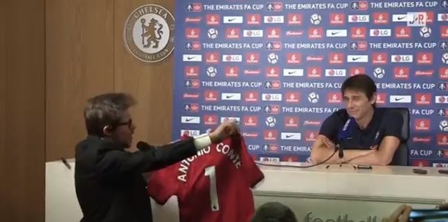 Antonio Conte's face when presented with a Manchester United shirt "signed by Jose Mourinho" 😳 😂 pic.twitter.com/O9yDt7vgQm