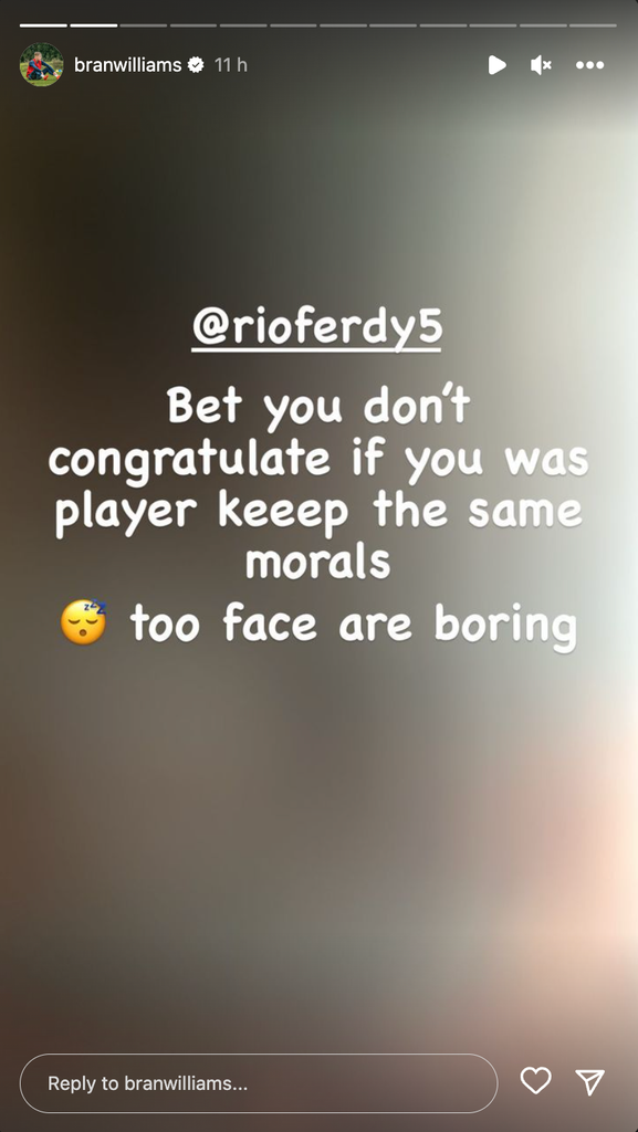 Williams wrote: ‘Rio Ferdinand, bet you don’t congratulate if you was player. Keep the same morals. Two faced [sic] is boring.’