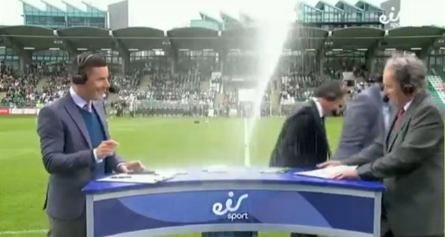 It's the clip everyone wants to see! The eir Sport panel were on the wrong end of a sprinkler @tallaghtstadium. #LOIinEurope pic.twitter.com/niVD15U72h