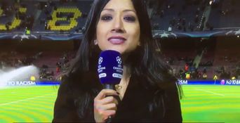 Standing on the touchline at Barcelona’s Nou Camp stadium, she can be seen getting a little tongue-tied as she introduces the match.