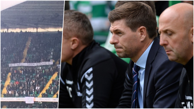 While Celtic’s title party was delayed on Saturday due to a 0-0 draw with Livingston, supporters were in great form and brought along a banner to Celtic Park aimed at Gerrard.
