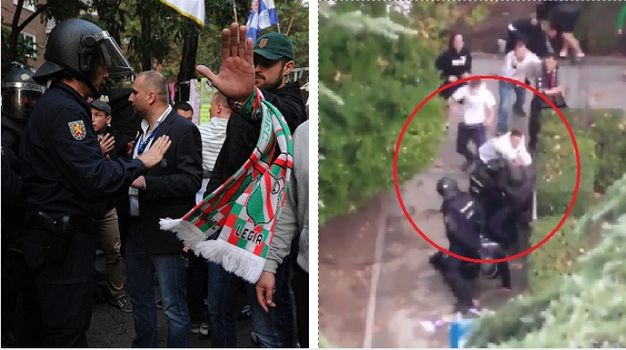 Cameras filmed dozens of Legia “fans” facing off against Spanish police near the ground. Missiles were thrown at officers who were armed with batons and some charged down the hooligans on horseback.