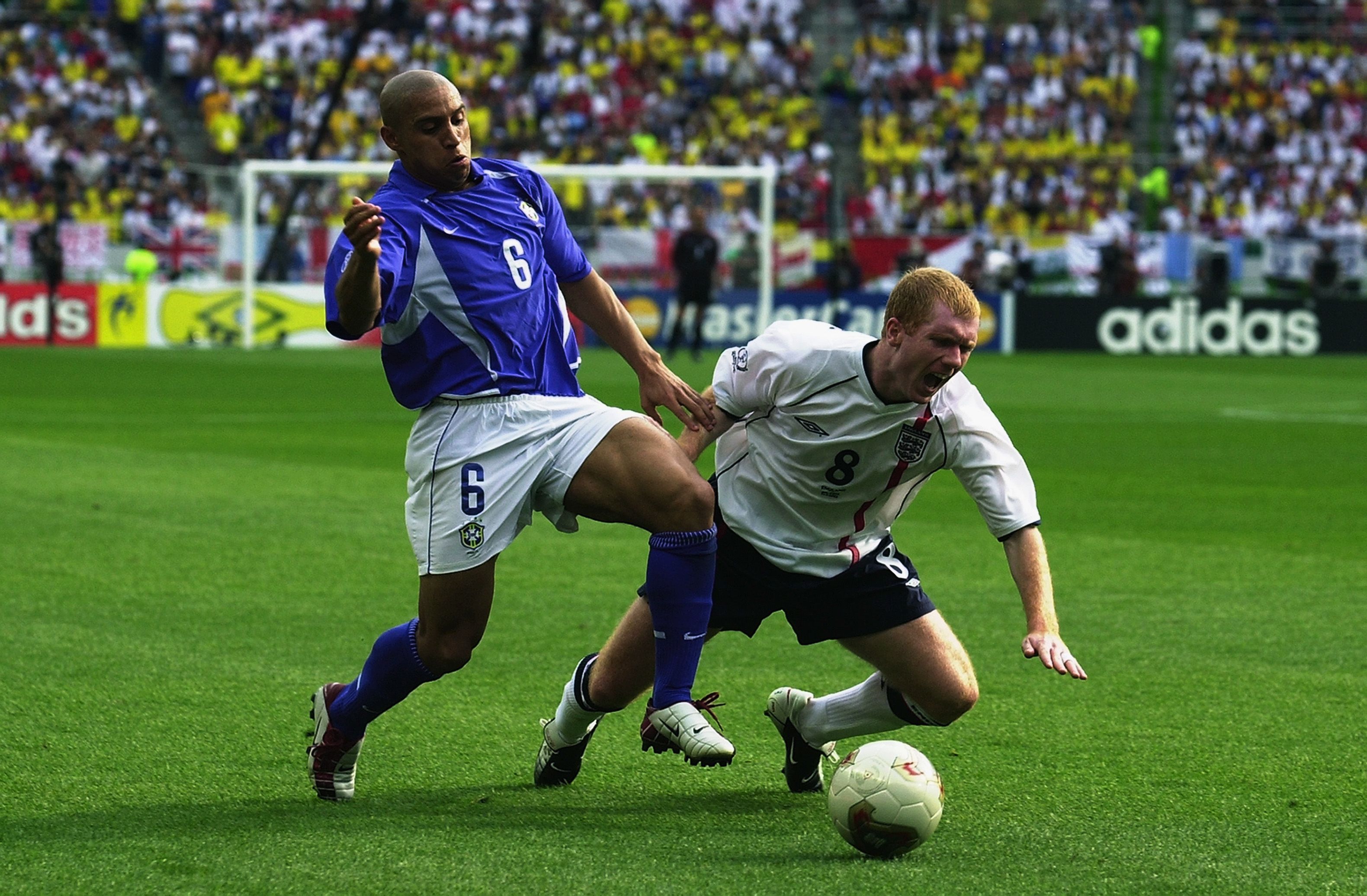 SHIZUOKA - JUNE 21: Roberto Carlos (left) of Brazil tackles Paul Scholes (right) of England in the first half of the England v Brazil World Cup Quarter Final match played at the Shizuoka Stadium Ecopa in Shizuoka, Japan on June 21, 2002. Brazil won the match 2-1. (Photo by Stu Forster/Getty Images)