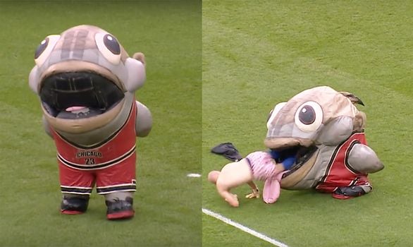 ‘Mackerel Jordan’, as he’s more commonly known, has been a big hit at basketball and baseball games over in the US for a while, and his debut in the Championship went down a treat as he ate what appeared to be one of the Derby goalkeeping coaches.