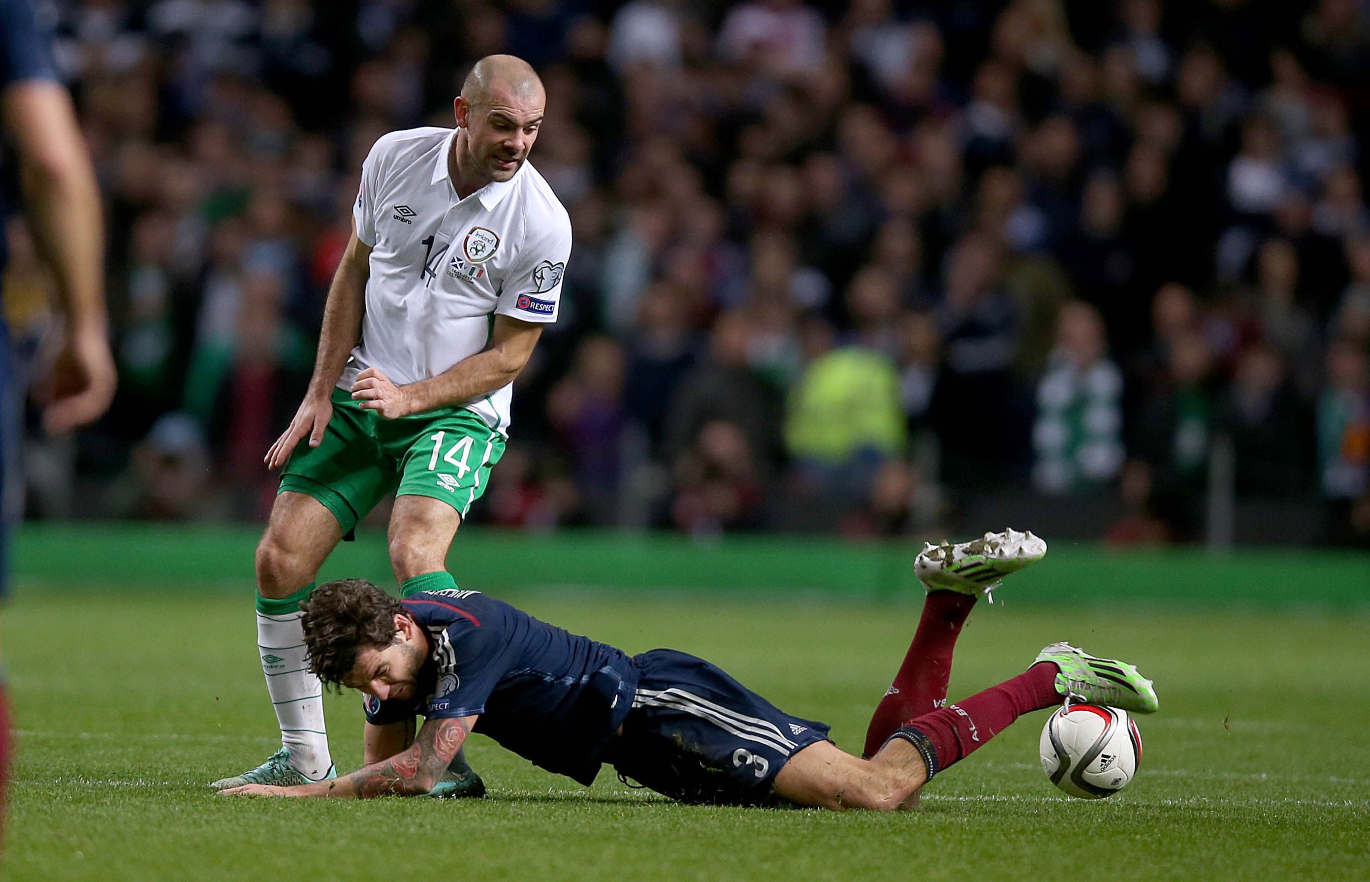 Ireland’s Darron Gibson with Steven Wittaker of Scotland