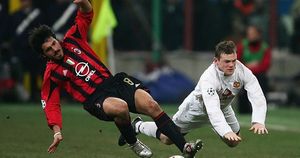 MILAN, ITALY - MARCH 8: Wayne Rooney of Manchester United is fouled by Gattuso of AC Milan during the UEFA Champions League match between AC Milan and Manchester United on March 8, 2005 at the San Siro Stadium in Milan, Italy. (Photo by Mike Hewitt/Getty Images)