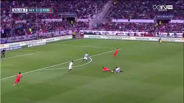 Sevilla were caught on the break, Messi picked up the ball on the half-way line and had Luis Suarez to his right, and Neymar to his left. Ninety-nine times out of 100, this scenario ends in a goal, this was the other time.