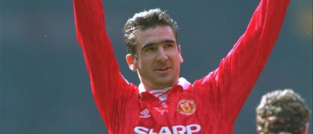 17 APR 1993: ERIC CANTONA OF MANCHESTER UNITED POINTS TO THE SKIES AFTER SCORING A GOAL DURING THEIR PREMIER LEAGUE MATCH AGAINST CHELSEA PLAYED AT OLD TRAFFORD. MANCHESTER UNITED WON THE MATCH 3-0.