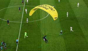 The activist, whose parachute displayed a message saying, “Kick Out Oil, Greenpeace,” almost collided with people in the stands of Bayern Munich’s stadium, avoiding them by a matter of feet, after he got caught on the spidercam equipment in the stadium