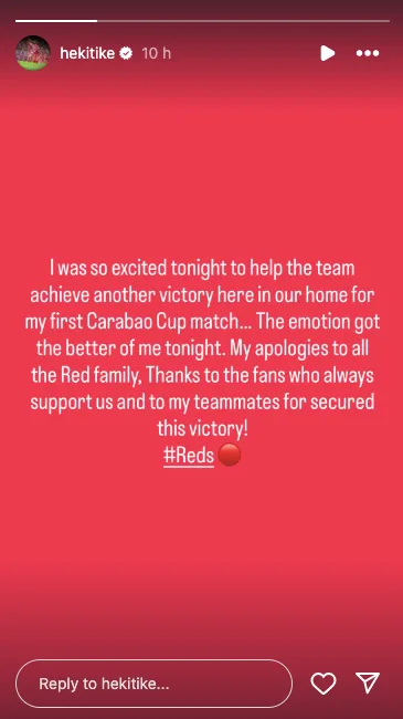 Liverpool’s new striker signing Hugo Ekitike has taken to Instagram to make a statement following his red card last night.