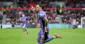 BRENTFORD, ENGLAND - FEBRUARY 17: Darwin Nunez of Liverpool celebrates after scoring his team's first goal during the Premier League match between Brentford FC and Liverpool FC at Gtech Community Stadium on February 17, 2024 in Brentford, England. (Photo by Justin Setterfield/Getty Images)