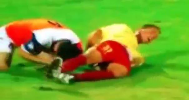 Penalised for an aerial challenge, the player proceeds to target his opponent on the ground in an… um, delicate area.