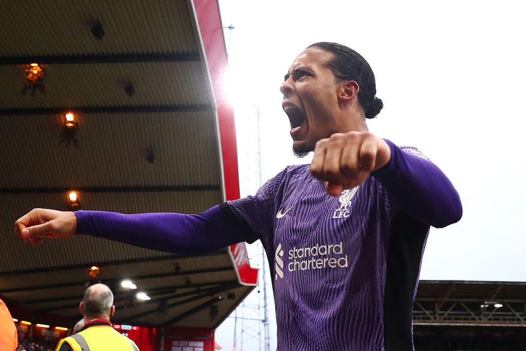 NOTTINGHAM, ENGLAND - MARCH 2: Virgil van Dijk of Liverpool celebrates during the Premier League match between Nottingham Forest and Liverpool FC at City Ground on March 2, 2024 in Nottingham, England. (Photo by Robbie Jay Barratt - AMA/Getty Images)