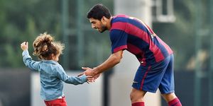 BARCELONA, SPAIN - SEPTEMBER 24: Luis Suarez of FC Barcelona hugs to his daughter Delfina Suarez after a friendly match between FC Barcelona B and Indonesia U19 at Ciutat Esportiva on September 24, 2014 in Barcelona, Spain. (Photo by David Ramos/Getty Images)