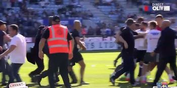 As you can see in the footage below, Lyon ‘keeper Mathieu Gorgelin was caught in the middle of the pitch invasion as stewards desperately tried to hold off the intruding fans.