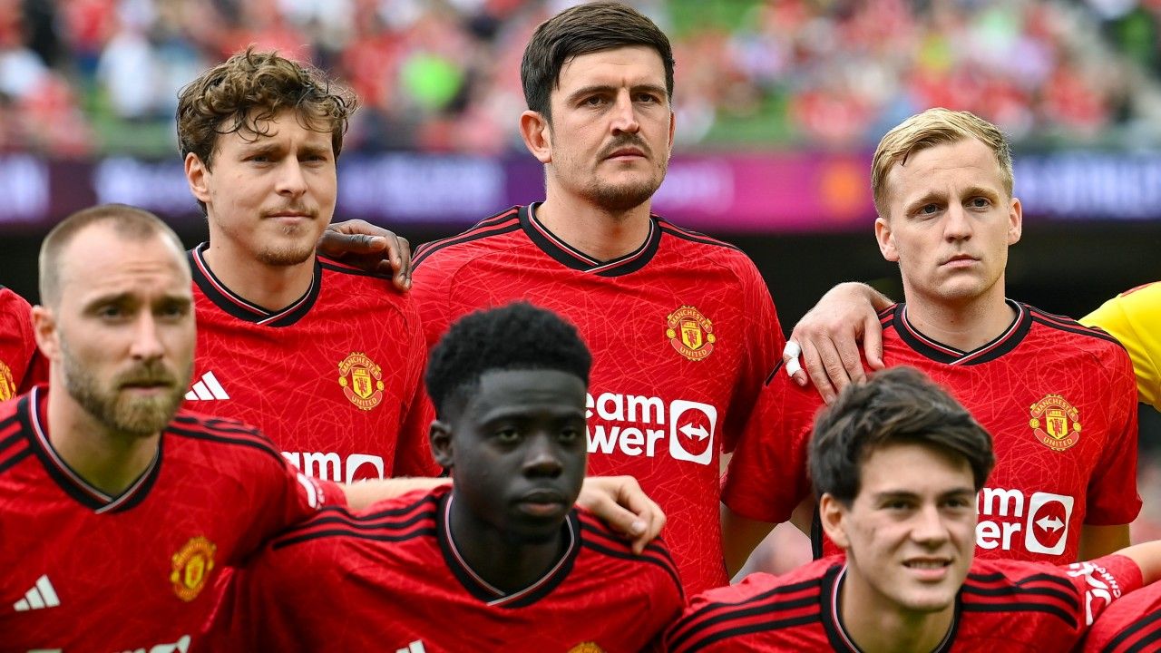 6 August 2023; Harry Maguire of Manchester United, centre, in the team photo before the pre-season friendly match between Manchester United and Athletic Bilbao at the Aviva Stadium in Dublin. Photo by David Fitzgerald/Sportsfile
