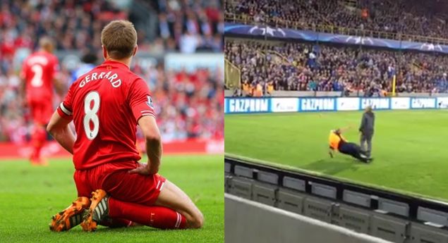 Fan invades the pitch and a steward falls over trying to catch him. 'Are you Gerrard in disguise?' is the response from the away end.