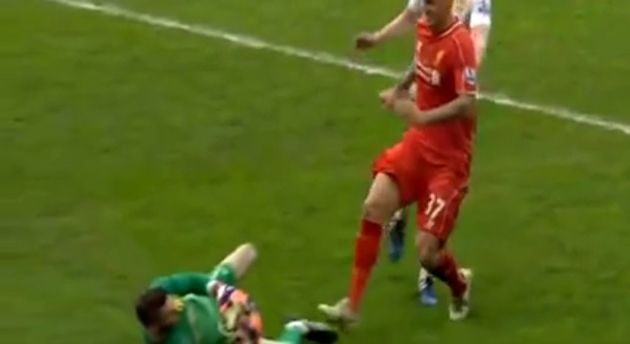 Liverpool boss Brendan Rodgers watched the incident back after he spoke to reporters but defended his player. He told Sky Sports, ‘The ball was played through but it probably looks worse in slow motion. It looks like he is trying to get a nick on the ball, to get a toe on it the ball went into the goalkeeper’s hands.