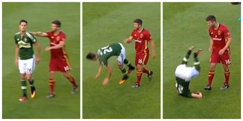 The 22-year-old received a light push in the back from one of the Real Salt Lake players, and responded in the only way that made sense to him – by throwing himself into the air and flipping onto his back.