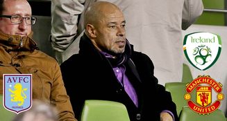 Denis Irwin is at left-back, where he played 56 times for Ireland and for United over 12 years. Brighton manager Chris Hughton is at right-back, with Kevin Moran and former Villa defender Shaun Teale in central defence.