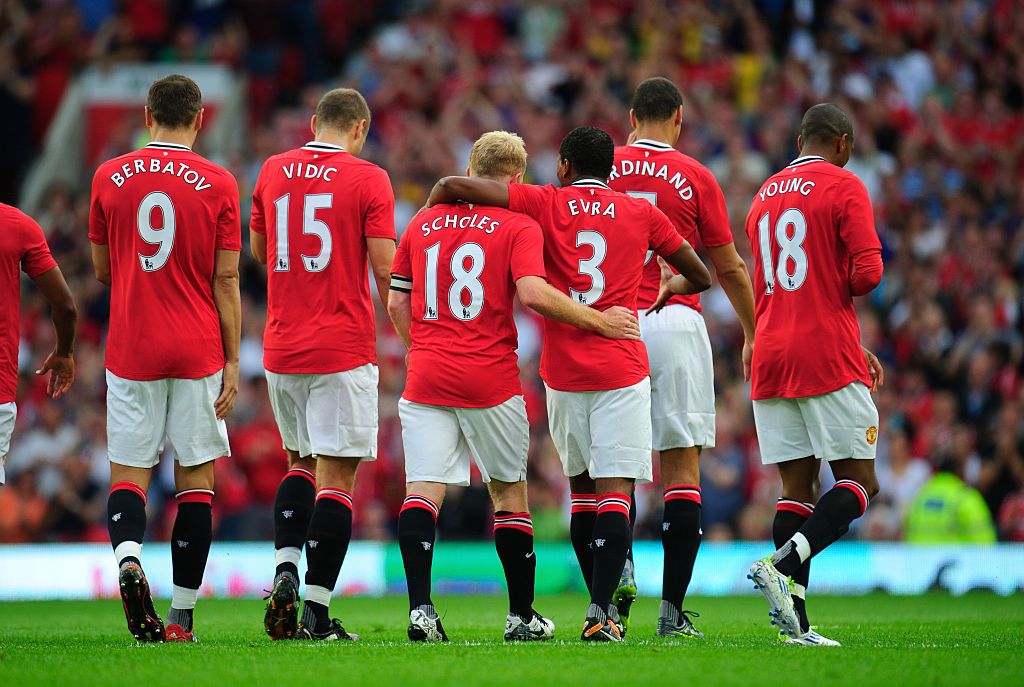 Paul Scholes of Manchester Untied celebrated after scoring a goal to make it 1-0 with his team mates (Photo by Matthew Ashton/AMA/Corbis via Getty Images)