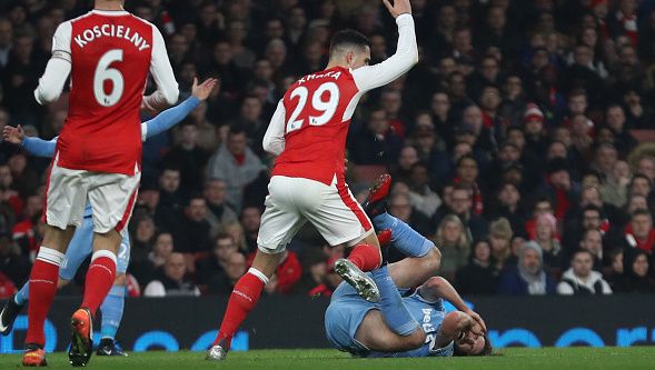 Need to see a replay again, but seems Xhaka might have hammered him with his elbow.