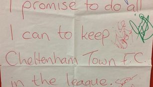 The Robins manager turned into a creche teacher and asked his players to sign the paper, saying: “I promise to do all I can to keep Cheltenham Town FC in the league.”