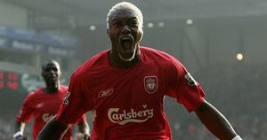 LIVERPOOL, ENGLAND - OCTOBER 15 : Djibril Cisse of Liverpool celebrates scoring the winning goal during the Barclays Premiership match between Liverpool and Blackburn Rovers on October 15, 2005 at Anfield in Liverpool, England. (Photo by Laurence Griffiths/Getty Images)