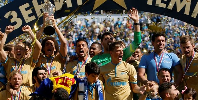 ST. PETERSBURG, RUSSIA - MAY 30: Zenit players celebrate winning the Russian Championship trophy after the Russian Football Premier League match between FC Zenit St. Petersburg and FC Lokomotiv Moscow at the Petrovsky Stadium on May 30, 2015 in Saint-Petersburg , Russia. (Photo by Epsilon/Getty Images)