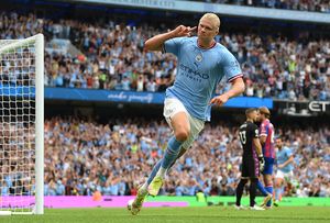 MANCHESTER, ENGLAND - AUGUST 27: Erling Haaland of Manchester City celebrates his hat trick during the Premier League match between Manchester City and Crystal Palace at Etihad Stadium on August 27, 2022 in Manchester, England. (Photo by Shaun Botterill/Getty Images)