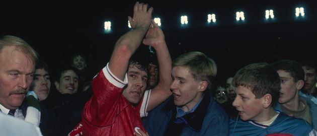MANCHESTER – NOVEMBER 20: Bryan Robson of Manchester United is mobbed by fans after his Testimonial Match between Manchester United and Celtic held on November 20, 1990 at Old Trafford, in Manchester, England. (Photo by Dan Smith/Getty Images)