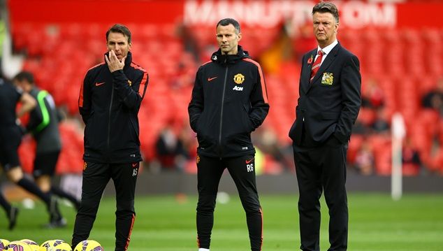 MANCHESTER, ENGLAND – NOVEMBER 08: Manchester United Manager Louis van Gaal looks on with his Assistants Albert Stuivenberg and Ryan Giggs (R) prior to the Barclays Premier League match between Manchester United and Crystal Palace at Old Trafford on November 8, 2014 in Manchester, England. (Photo by Richard Heathcote/Getty Images)