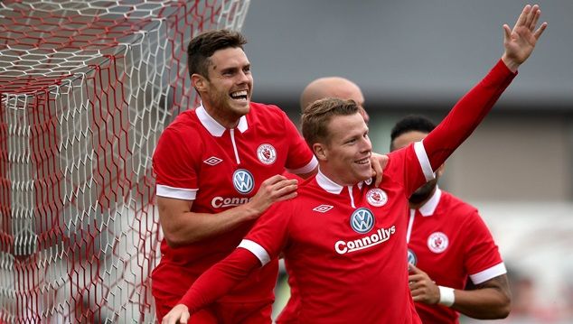 Sligo’s Danny North celebrates scoring the opening goal of the game with John Russell