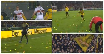 During the game, Jurgen Klopp’s old support lobbed tennis ball after tennis ball onto the pitch that caused a delay in the game. We don’t just mean two or three, we mean a sh*t load.