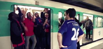 In the video, a fan pictured in a Chelsea top with Terry at the back is taunted and teased and pushed back as he tries to get onto a train.