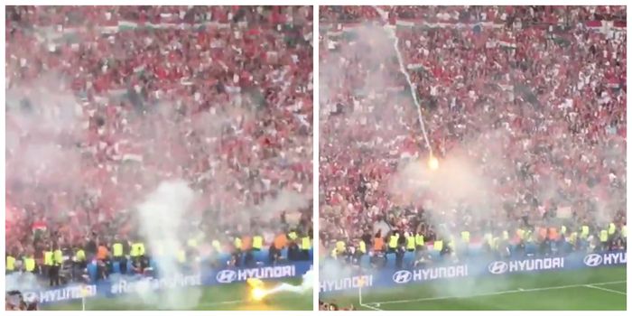 Now, new footage shows just how dangerous the situation was in the Hungarian fans’ section at the Stade Vélodrome. The video below shows the flaming devices being lit in the stands, then thrown onto the pitch. A linesman grabs the flare and runs off with it. Seconds later another lit flare is lobbed into the air, but instead of landing on the pitch, lands in a fan area just in front of the pitch.