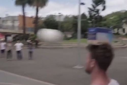 We hope there was a sizeable bet involved as the first effort almost smashes his friend in the face, but the second clips the box enough to send it falling to the floor.