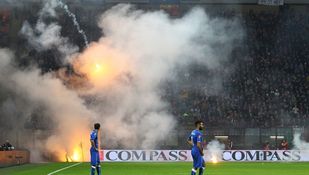 Following that goal the game was suspended for three minutes after flares were thrown on onto the pitch.