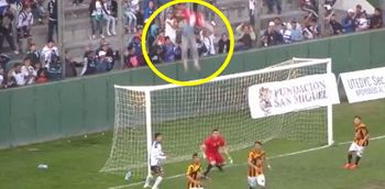There was a “holy shit” moment in the lower leagues in Argentina over the weekend, as a fan fell from the high up in the stands and came crashing down to the ground behind the goals at a ridiculous speed.
