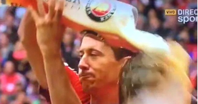 After Bayern Munich played out their final game of the season at the Allianz Arena, their joint top-scorer was enjoying a giant glass of Paulaner when his teammate’s head looked too tempting a target and the Polish forward let fly.